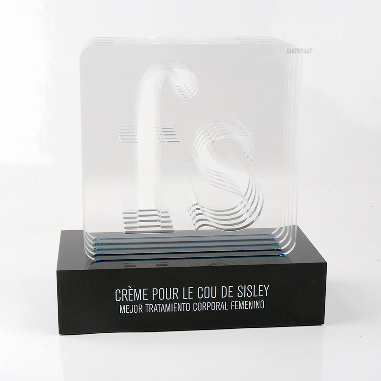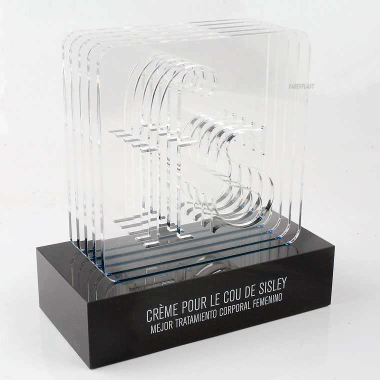 Tropheé plexiglas pour la marque de cosmétiques FS construit sur mesure. Plaques multiples faits méthacrylate transparent (Plexiglas-PMMA) coupé par laser avec le logo du client police. Et les plaques de base à haute brillance méthacrylate noir (Plexiglas-PMMA) imprimé digitale avec des textes fournis par le client.