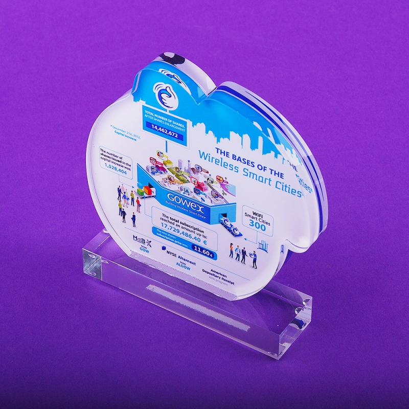 Trophées personnalisés pour la société que Gowex. Fabriqué en acrylique transparent (plexiglas, PMMA), se détachant par laser et étiquetées sous le corporate design du client en utilisant limpression numérique de haute résolution pour les deux cí´tés.