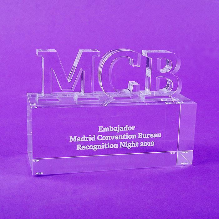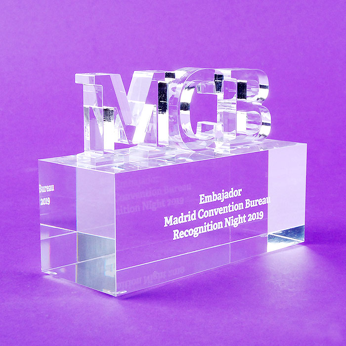 Trophée en plexiglas simple mais très élégant, créé à l’occasion des prix MCB (Madrid Convention Bureau).