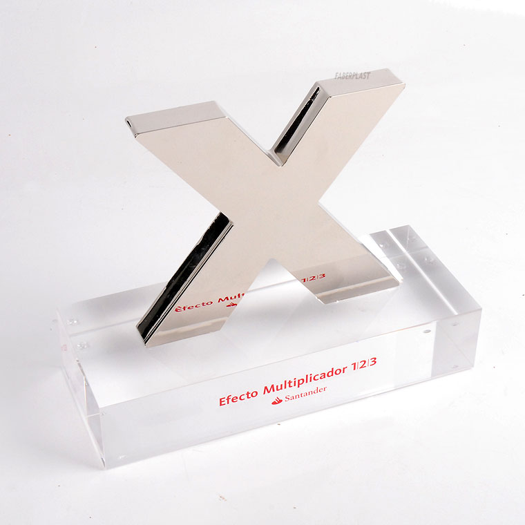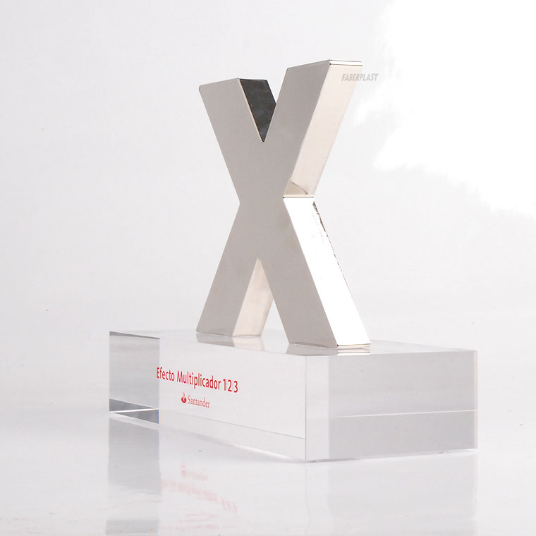 Tropheé plexiglas pour l'entité BANCO SANTANDER fait sur mesure. Fabriqué sur les plaques de base de méthacrylate transparent (Plexiglas-PMMA) avec étiquetage dans l'impression digitale. Plaque supérieure méthacrylate comprend un métal revêtu de finition nickel brillant.