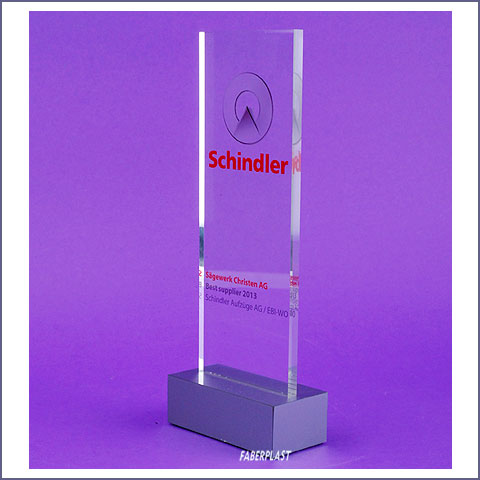 Trophée plexiglas fait entreprise SCHINDLER. Fabriqué en plaques plexi transparents (plexiglas, pmma) et la couleur plexiglas brillant argent pour la base. Avec des textes en matií¨re détiquetage et logo de lentreprise par limpression numérique directe avec des encres UV.