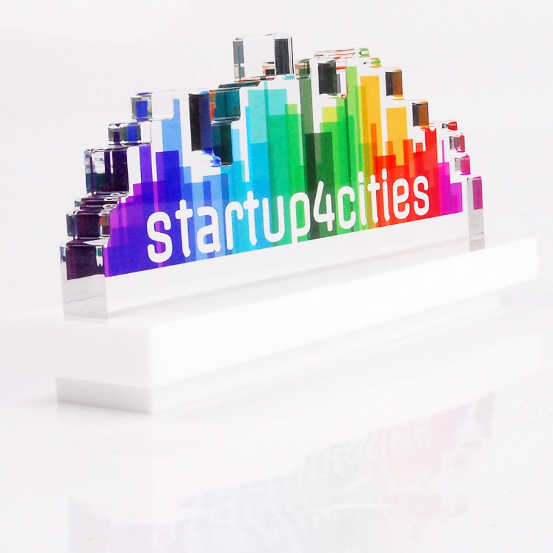 Tropheé plexiglas de défi fait sur mesure pour les entreprises STARTUP 4 villes. Fabriqué avec des plaques transparentes et acrylique plexi blanc (plexiglas, pmma) laser silhouette selon la conception du client et décoré avec limpression digitale directe en haute résolution.