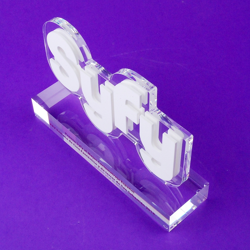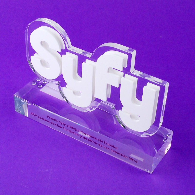 Trophy plexiglas fait pour la chaîne de télévision SyFy: www.syfy.fr Fait que des plaques blanches et transparent plexi (Plexiglas-PMMA) se profilant au laser et le texte dimpression directe numérique basée.