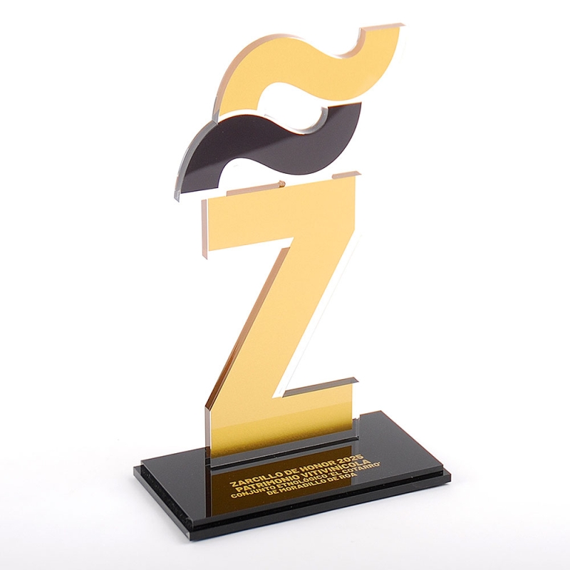 Trophées personnalisés silhouettés au laser et réalisés à la main en méthacrylate transparent et noir (Plexiglas®-PMMA). Impression numérique avec des encres ECO-UV de haute qualité et résistance, avec une grande netteté des couleurs et une grande profondeur. Bords lisses, polis, incolores et très brillants.
