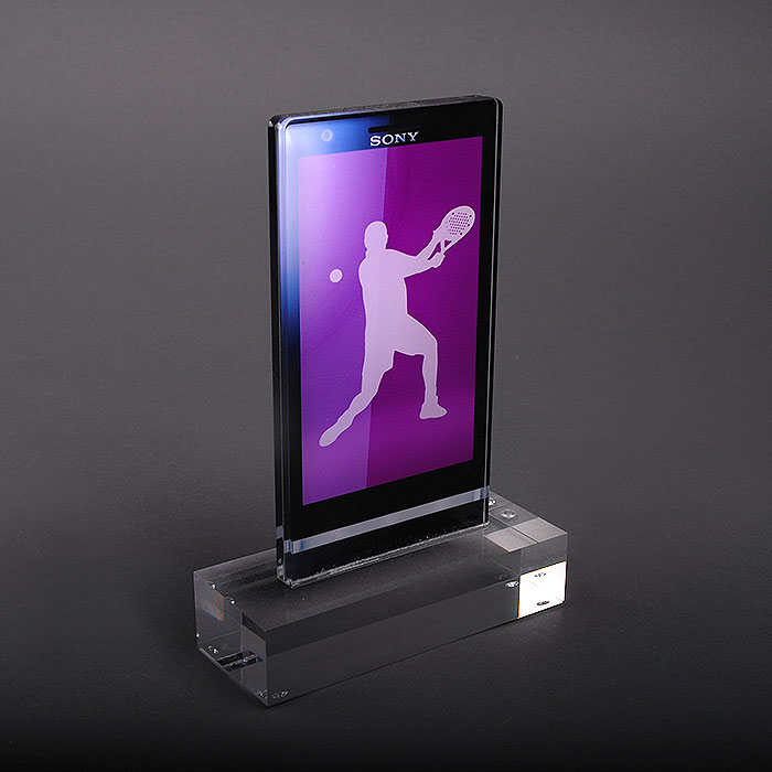 Trophée en méthacrylate réalisé pour la société SONY à l'occasion du lancement d'un nouveau smartphone.