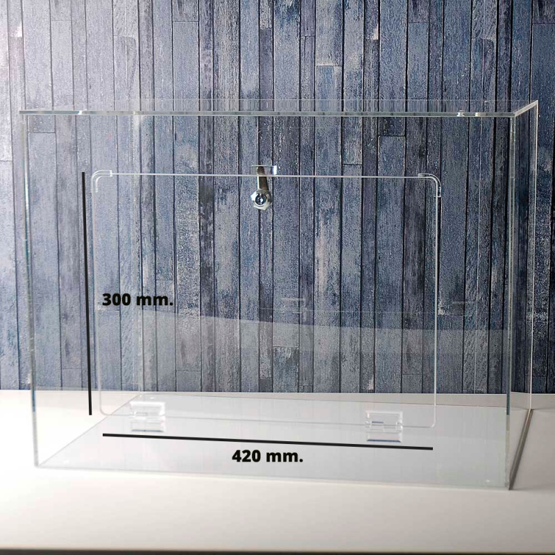 Vitrine avec format FENÊTRE en méthacrylate pour tout type d'objets pour l'exposition, la décoration ou les points de vente. Comprend une serrure à double clé et une base BLANCHE. Fabriquée à la main par nos spécialistes techniques. Vos produits et objets toujours bien soignés et présentés avec la grande transparence d'un matériau noble comme le méthacrylate.