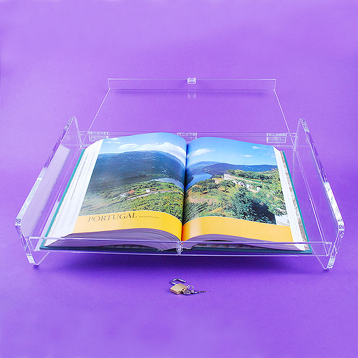 Vitrine en méthacrylate-plexiglas spécialement conçue pour L'EXPOSITION DE LIVRES spéciaux grand format.