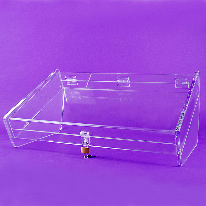 Fabrication sur mesure et de forme artisanale avec des plaques de méthacrylate transparent (Plexiglas-pmma) de différentes épaisseurs. Comprend serrure de sécurité et porte à charnière.